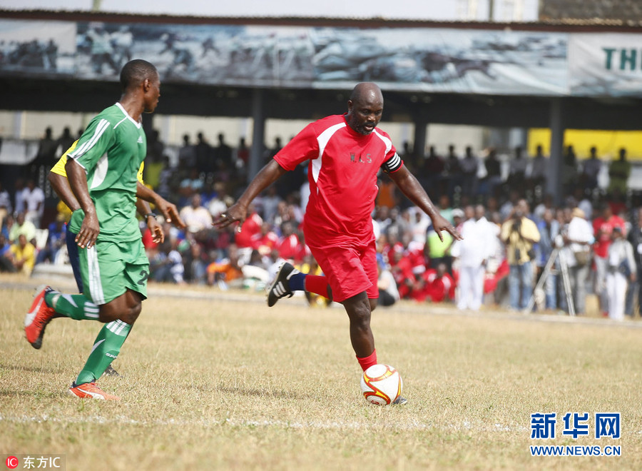 1月20日,利比里亞首都蒙羅維亞,利比里亞當選總統(tǒng)、前世界足球先生喬治-維阿參加慈善足球比賽,率領(lǐng)維阿全明星隊對戰(zhàn)利比里亞武裝部隊士兵隊。喬治-維阿在去年12月27日當選利比里亞新一任總統(tǒng),并將于2018年1月22日就職。(圖片來源:東方IC)