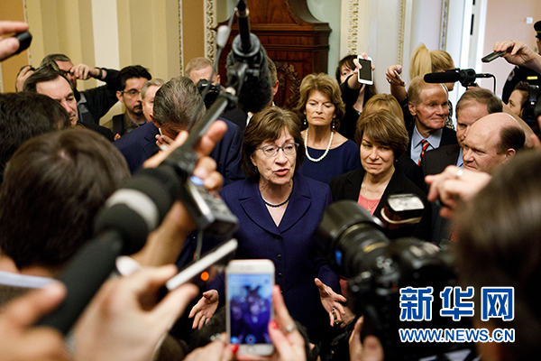 1月22日,在美國華盛頓國會山,參議員蘇珊·柯林斯(中)被記者包圍。新華社發(fā)(沈霆攝)