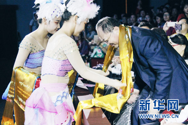 藝術(shù)團(tuán)演員為現(xiàn)場貴賓敬獻(xiàn)哈達(dá)。