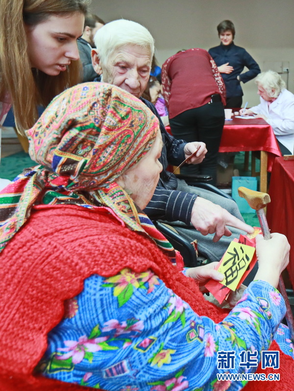 這是7日基輔國立語言大學(xué)孔子學(xué)院與當(dāng)?shù)鼐蠢显号e行2018新春聯(lián)歡晚會(huì)時(shí)的一幕。當(dāng)晚,孔院30多名師生給敬老院150多名孤殘老人帶來了多個(gè)中國文化體驗(yàn)項(xiàng)目,并表演了精彩的文藝節(jié)目。