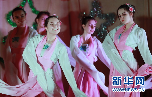 基輔國立語言大學(xué)孔子學(xué)院的學(xué)生表演中國舞蹈《采薇》。新華網(wǎng)發(fā)(陳俊鋒攝)