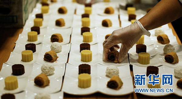 2月8日,在美國洛杉磯,廚師準(zhǔn)備傳統(tǒng)中式點心“驢打滾”、“艾窩窩”、“豌豆黃”和“紅豆涼糕”。 新華社記者 李穎 攝