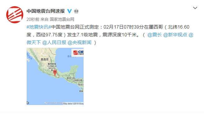 新華社快訊:中國地震臺網正式測定:2月17日7時39分,在墨西哥(北緯16.60度,西經97.75度)發(fā)生7.1級地震,震源深度10公里。