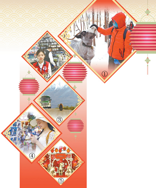 圖①:中國(guó)游客在俄羅斯摩爾曼斯克與馴鹿在一起。