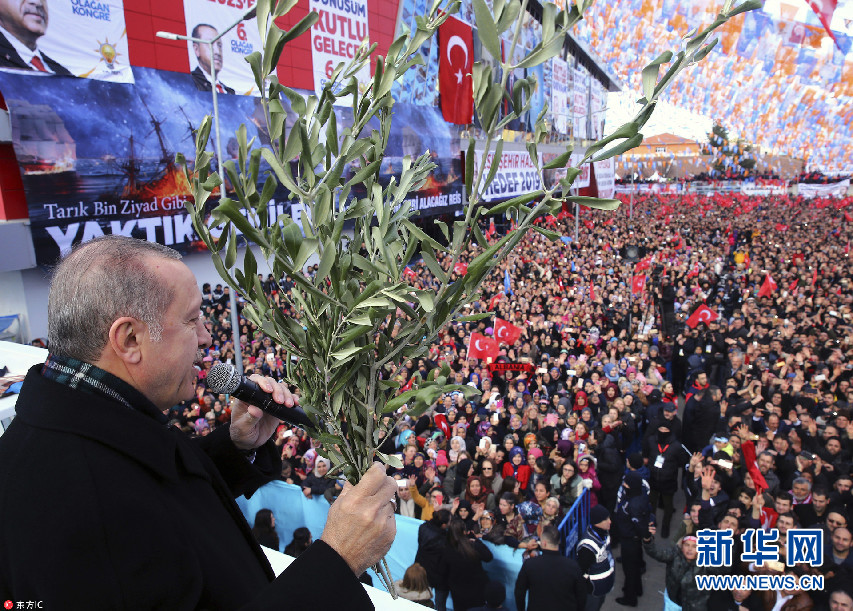 當(dāng)?shù)貢r間2018年2月17日,土耳其埃斯基謝希爾,土耳其總統(tǒng)埃爾多安出席正義與發(fā)展黨集會,手持橄欖枝發(fā)表講話。(圖片來源:東方IC)