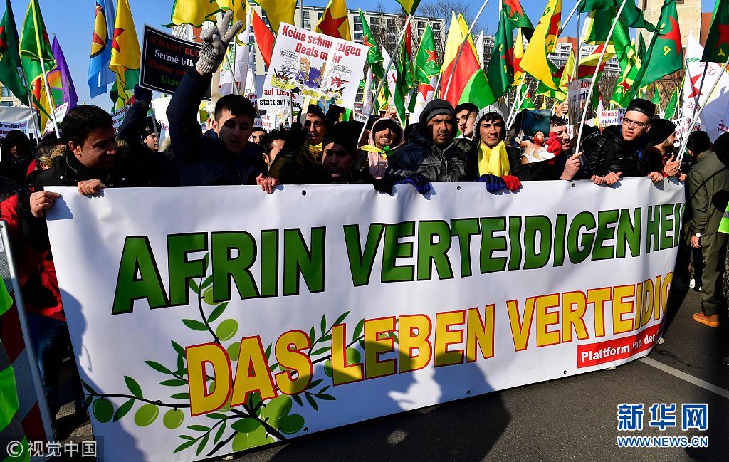 當(dāng)?shù)貢r(shí)間2018年3月3日,德國(guó)柏林,當(dāng)?shù)孛癖娕e行游行,抗議土耳其對(duì)敘利亞阿夫林地區(qū)的庫(kù)爾德人采取軍事行動(dòng)。(圖片來源:視覺中國(guó))