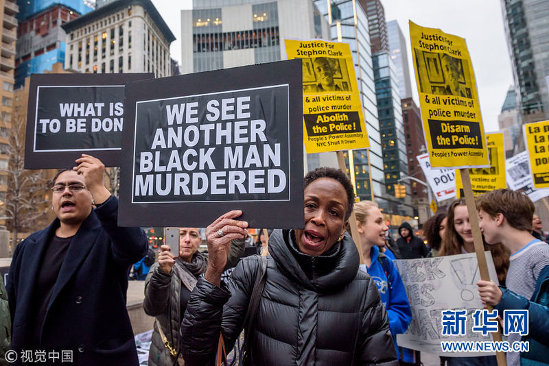 3月28日,美國(guó)紐約,數(shù)百民眾走上街頭參加游行,抗議加州黑人男子克拉克(Stephon Clark)遭警方誤殺。(圖片來源:視覺中國(guó))