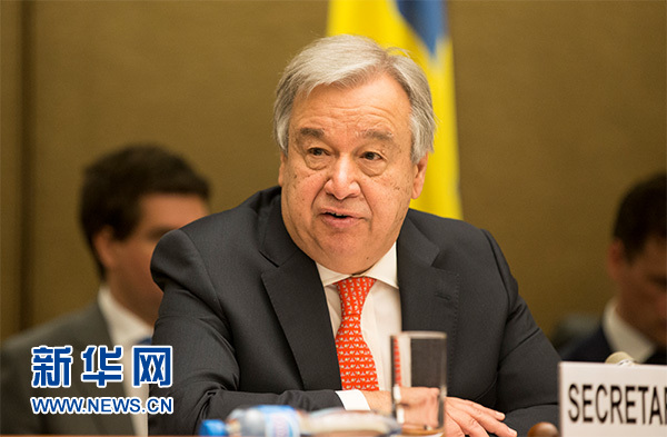 4月3日,在瑞士日內(nèi)瓦萬(wàn)國(guó)宮,聯(lián)合國(guó)秘書長(zhǎng)古特雷斯出席也門人道援助高級(jí)別捐助會(huì)議。新華社記者 徐金泉 攝