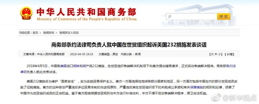 2018年4月5日,中國就美國進口鋼鐵和鋁產(chǎn)品232措施,在世貿(mào)組織爭端解決機制項下向美方提出磋商請求,正式啟動爭端解決程序。商務部條約法律司負責人就此發(fā)表談話。