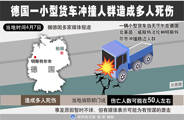 新華社柏林4月7日電(記者袁帥 沈忠浩)據(jù)德國(guó)多家媒體7日?qǐng)?bào)道,一輛小型貨車(chē)當(dāng)天下午在德國(guó)西部北萊茵-威斯特法倫州明斯特爾市沖撞路邊人群,造成多人死傷。當(dāng)?shù)叵啦块T(mén)說(shuō),傷亡人數(shù)可能在50人左右。