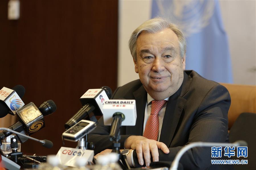 ?。丛拢等?,在位于紐約的聯(lián)合國總部,聯(lián)合國秘書長古特雷斯接受中國媒體聯(lián)合采訪。新華社記者李木子攝