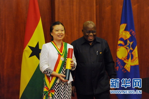 4月10日,加納總統(tǒng)阿庫福-阿多向中國駐加納大使孫保紅授予“加納之星”榮譽勛章。新華網(wǎng)記者石松 攝