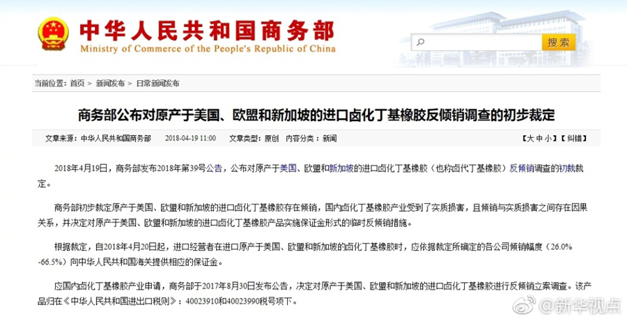 新華網(wǎng)北京4月19日電 商務(wù)部今天發(fā)布公告,初步裁定原產(chǎn)于美國、歐盟和新加坡的進(jìn)口鹵化丁基橡膠存在傾銷。根據(jù)裁定,自2018年4月20日起,進(jìn)口經(jīng)營者在進(jìn)口原產(chǎn)于美國、歐盟和新加坡的鹵化丁基橡膠時(shí),應(yīng)依據(jù)裁定所確定的各公司傾銷幅度(26.0%-66.5%)向中華人民共和國海關(guān)提供相應(yīng)的保證金。?(據(jù)新華社“新華視點(diǎn)”微博報(bào)道)