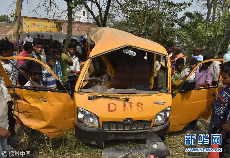 當(dāng)?shù)貢r(shí)間2018年4月26日,一輛載有22名兒童的校車在印度北方邦庫新加同一輛火車相撞,事故造成13名兒童死亡,8人傷勢嚴(yán)重。(圖片來源:視覺中國)
