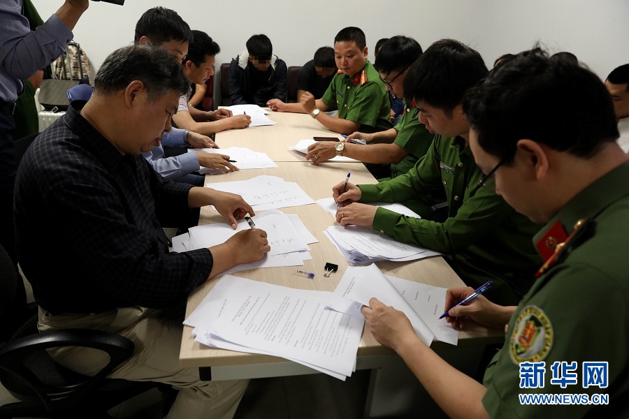 4月28日,中越警方簽署移交相關文件。當日,越南警方在河內(nèi)內(nèi)排國際機場向中國警方工作組移交了許某等8名涉嫌詐騙罪的在逃嫌疑人。中國警方“獵狐行動”在越南再獲新成果。新華社記者王迪攝