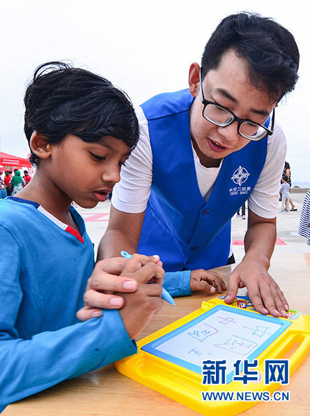 5月4日,在馬爾代夫首都馬累市中心停機(jī)坪廣場(chǎng),中國(guó)志愿者教當(dāng)?shù)貎和瘜憹h字。新華社發(fā)(杜才良 攝)