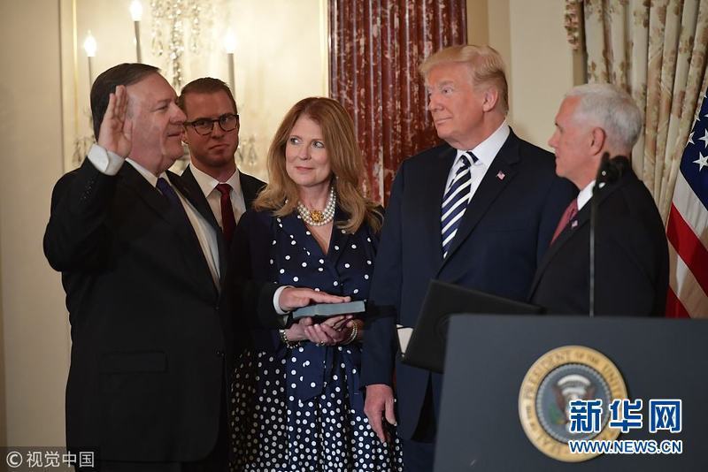 資料圖:5月2日,美國華盛頓,邁克·蓬佩奧在總統(tǒng)特朗普的見證下正式宣誓就職美國國務卿。新華網發(fā)