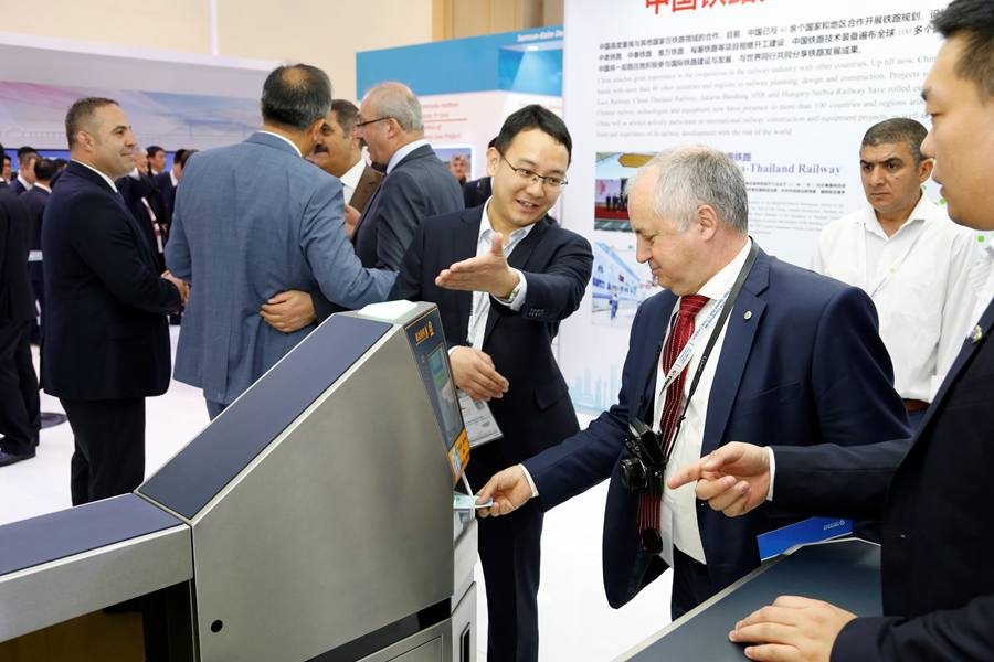 5月8日,在土耳其安卡拉,觀眾在國(guó)際高鐵大會(huì)上體驗(yàn)中國(guó)鐵路檢票閘機(jī)。新華社記者 秦彥洋 攝