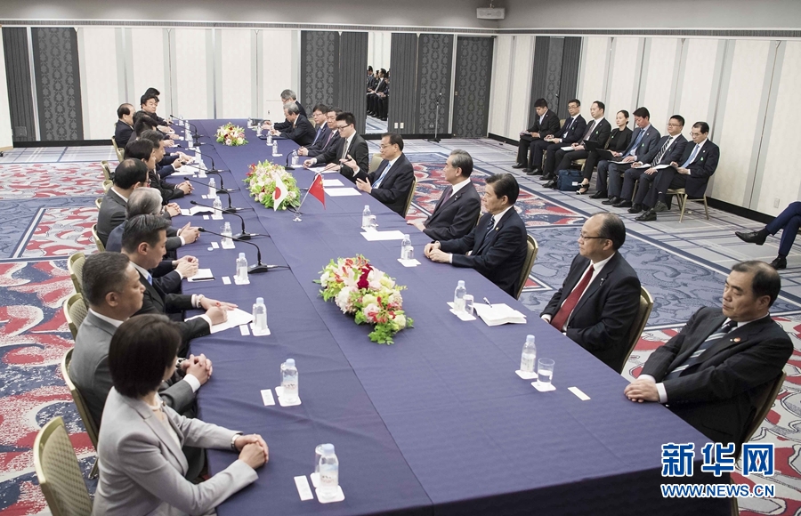當(dāng)?shù)貢r間5月10日下午,國務(wù)院總理李克強在東京下榻飯店會見日本在野黨負(fù)責(zé)人。新華社記者 李濤 攝