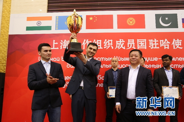 ? 中國駐哈薩克斯坦大使張漢暉(前排右一)為冠軍獲得者塔吉克斯坦隊(duì)頒發(fā)獎(jiǎng)杯。 新華網(wǎng)發(fā) 阿比洛夫攝