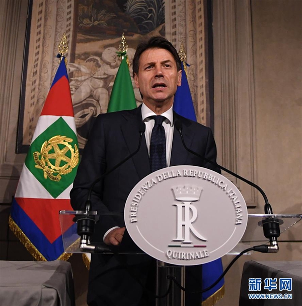 5月27日,在意大利首都羅馬,意新任總理孔特發(fā)表講話(huà)。據(jù)當(dāng)?shù)孛襟w報(bào)道,孔特27日晚間與總統(tǒng)馬塔雷拉會(huì)面并提交擬定的內(nèi)閣成員名單時(shí),馬塔雷拉否決了由意大利聯(lián)盟黨和五星運(yùn)動(dòng)力推的持疑歐立場(chǎng)的經(jīng)濟(jì)學(xué)家保羅·薩沃納出任財(cái)政部長(zhǎng)??滋叵蚩偨y(tǒng)提出放棄組閣任務(wù)請(qǐng)求,請(qǐng)求得到總統(tǒng)確認(rèn)。新華社發(fā)(阿爾貝托·林格里亞攝)
