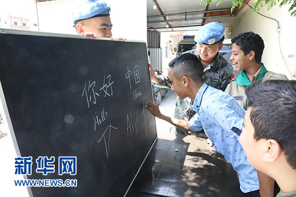 5月31日,在黎巴嫩南部的曼蘇里村,中國維和官兵教當(dāng)?shù)貎和瘜W(xué)習(xí)中文。 新華社發(fā)(蒙卓霖 攝)