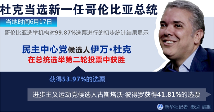 新華社波哥大6月17日電(記者何珊)哥倫比亞總統(tǒng)選舉第二輪投票17日在平靜中結(jié)束。右翼候選人杜克戰(zhàn)勝左翼候選人彼得羅,當選哥倫比亞新一任總統(tǒng)。杜克將于8月7日宣誓就職,任期至2022年。