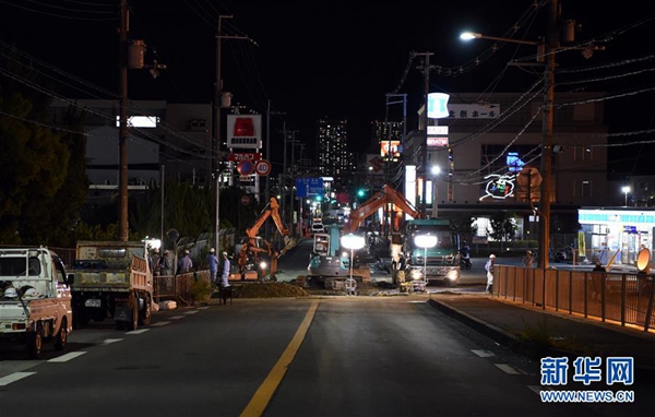 6月18日,在日本大阪,工程人員搶修破損道路。據(jù)日本氣象廳消息,當(dāng)?shù)貢r間18日上午7時58分,日本大阪府發(fā)生6.1級地震。新華社記者馬平 攝