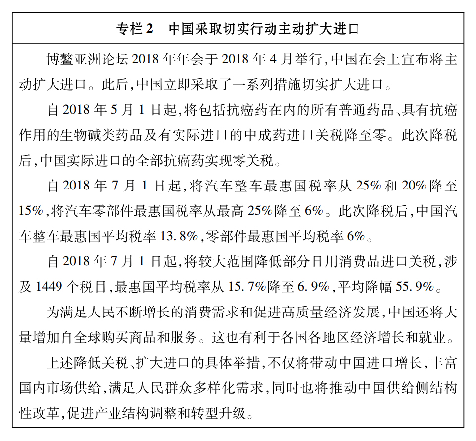 站在新時(shí)代的歷史起點(diǎn)上,中國(guó)開放的大門不會(huì)關(guān)閉,只會(huì)越開越大。中國(guó)過去40年的經(jīng)濟(jì)發(fā)展是在開放條件下取得的,未來中國(guó)經(jīng)濟(jì)實(shí)現(xiàn)高質(zhì)量發(fā)展也將在更加開放條件下進(jìn)行。中國(guó)將繼續(xù)堅(jiān)持對(duì)外開放基本國(guó)策,以更加積極的姿態(tài)融入經(jīng)濟(jì)全球化進(jìn)程,實(shí)行高水平的貿(mào)易和投資自由化便利化政策,與各國(guó)構(gòu)建利益高度融合、彼此相互依存的命運(yùn)共同體。