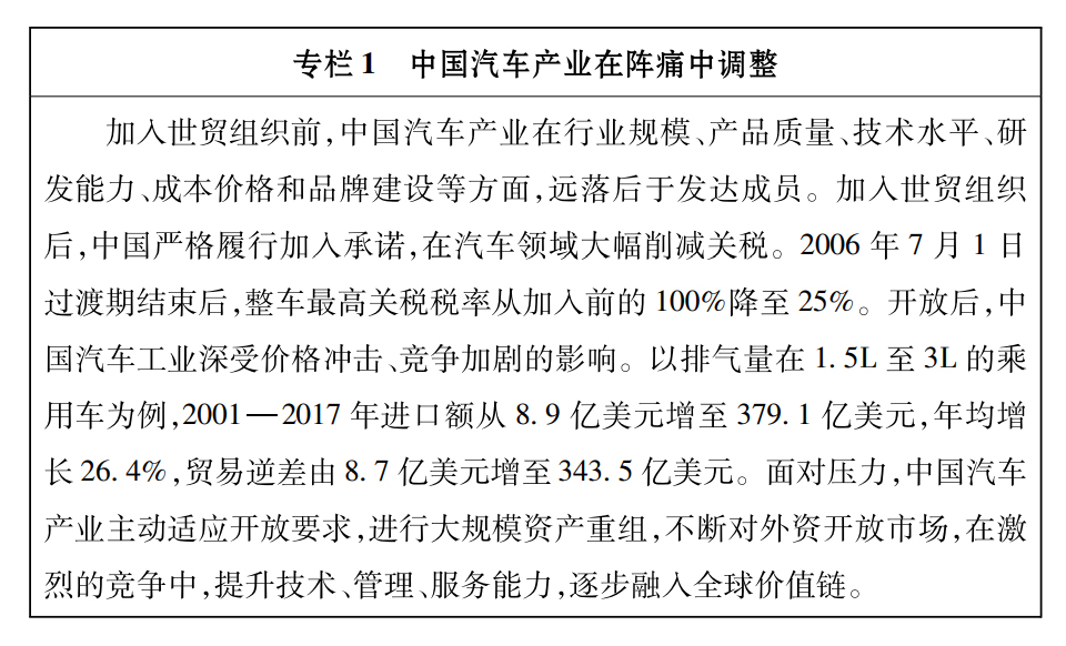 中國(guó)在加入世貿(mào)組織時(shí)作出廣泛而深入的開放承諾,國(guó)內(nèi)企業(yè)直接面對(duì)國(guó)際競(jìng)爭(zhēng),多數(shù)產(chǎn)業(yè)面臨較大困難。中國(guó)企業(yè)主動(dòng)應(yīng)對(duì)挑戰(zhàn),大力推進(jìn)產(chǎn)業(yè)結(jié)構(gòu)調(diào)整,積極參與全球價(jià)值鏈,國(guó)際競(jìng)爭(zhēng)力明顯提升。