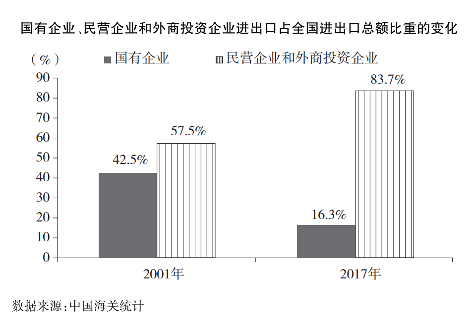 全面放開外貿(mào)經(jīng)營(yíng)權(quán)。促進(jìn)經(jīng)營(yíng)主體多元化,激發(fā)各類企業(yè)開展貿(mào)易的積極性。自2004年7月起,中國(guó)對(duì)企業(yè)的外貿(mào)經(jīng)營(yíng)權(quán)由審批制改為備案登記制,極大地釋放了民營(yíng)企業(yè)的外貿(mào)活力,民營(yíng)企業(yè)進(jìn)出口發(fā)展迅速,份額持續(xù)擴(kuò)大,成為對(duì)外貿(mào)易的重要經(jīng)營(yíng)主體。民營(yíng)企業(yè)和外商投資企業(yè)進(jìn)出口占全國(guó)進(jìn)出口總額的比重由2001年的57.5%上升到2017年的83.7%。2017年,作為第一大出口經(jīng)營(yíng)主體的民營(yíng)企業(yè)出口占比達(dá)46.6%。
