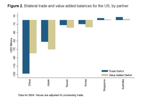 更引人注目的是,如此計算的話,那么比如2004年時日本和美國的貿(mào)易逆差就會暴增33%,直接逼近當(dāng)時中美按這種算法得出的貿(mào)易逆差了——畢竟,在不少中國出口給美國的產(chǎn)品中,擁有專利技術(shù)的日本的“附加價值”是很高的。