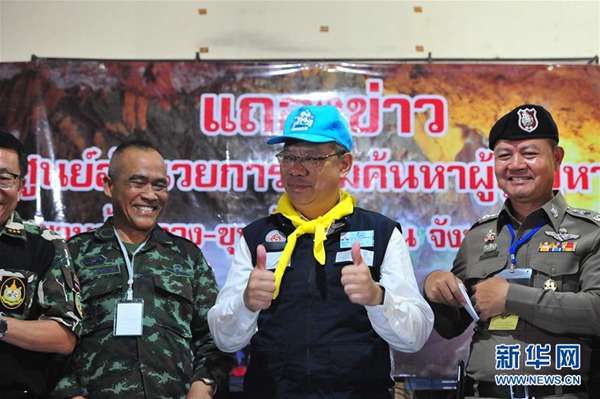 7月10日,在泰國清萊,清萊府府尹那榮薩(右二)在新聞發(fā)布會上慶祝救援成功。新華社發(fā)(拉亨 攝)