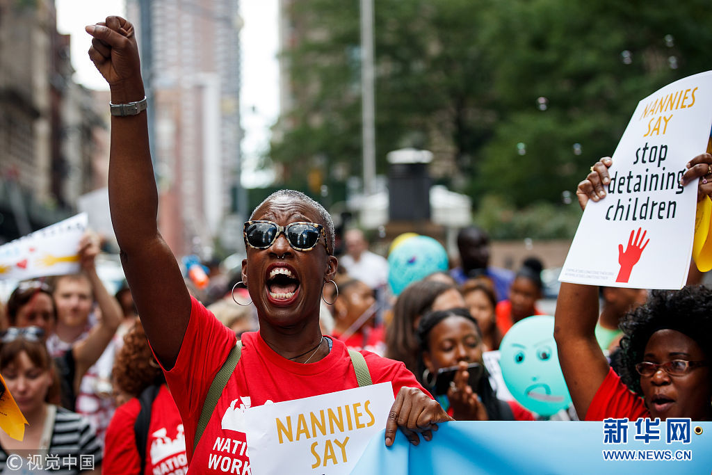 當(dāng)?shù)貢r(shí)間2018年7月18日,美國(guó)紐約,包括托兒所從業(yè)人員、父母及其子女在內(nèi)的社會(huì)各界人士在美國(guó)移民和海關(guān)執(zhí)法局(ICE)附近組織示威游行,抗議特朗普政府近期在美國(guó)南部邊境實(shí)施針對(duì)非法移民家庭的強(qiáng)制拘留和家庭成員離散政策。當(dāng)天,共和黨領(lǐng)導(dǎo)的眾議院通過(guò)了支持ICE的決議,并譴責(zé)一些民主黨人和進(jìn)步積極分子要求廢除ICE的呼聲。(圖片來(lái)源:視覺(jué)中國(guó))