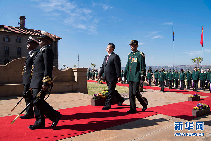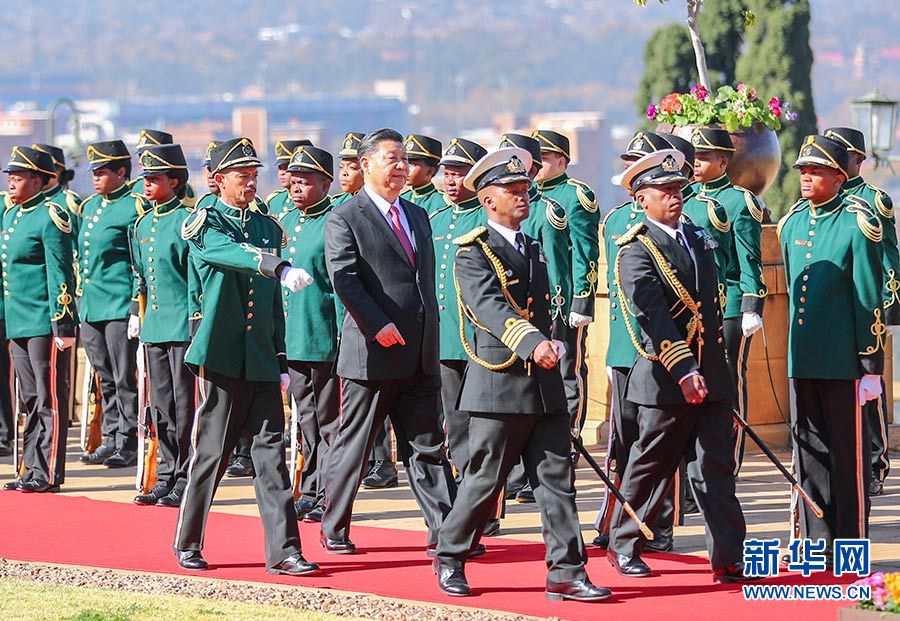 總統(tǒng)府前廣場,微風(fēng)拂面,陽光和煦。中南兩國國旗迎風(fēng)飄揚(yáng)。習(xí)近平和夫人彭麗媛受到拉馬福薩和夫人莫采佩熱情迎接。兩國元首夫婦登上檢閱臺。儀仗隊行持槍禮。軍樂隊奏中國國歌?,F(xiàn)場鳴放21響禮炮。習(xí)近平檢閱儀仗隊。軍樂隊奏南非國歌。習(xí)近平和彭麗媛同南方主要官員握手。拉馬福薩夫婦同中方陪同人員握手。兩國元首夫婦親切寒暄。拉馬福薩對習(xí)近平在南中建交20周年之際訪問南非并出席金磚國家領(lǐng)導(dǎo)人會晤表示熱烈歡迎。