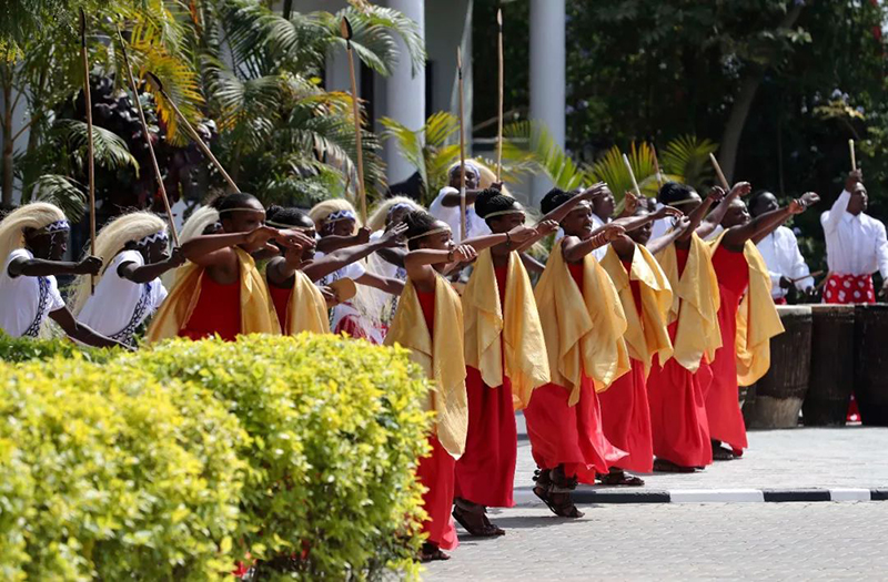 盛裝禮兵英姿挺拔,向尊貴的客人行注目禮。鼓聲響起,盧旺達(dá)民眾身著靚麗民族服裝,跳起熱情的迎賓舞,時(shí)而舒展柔緩,時(shí)而剛健有力。兩國(guó)元首駐足觀看,揮手致意。