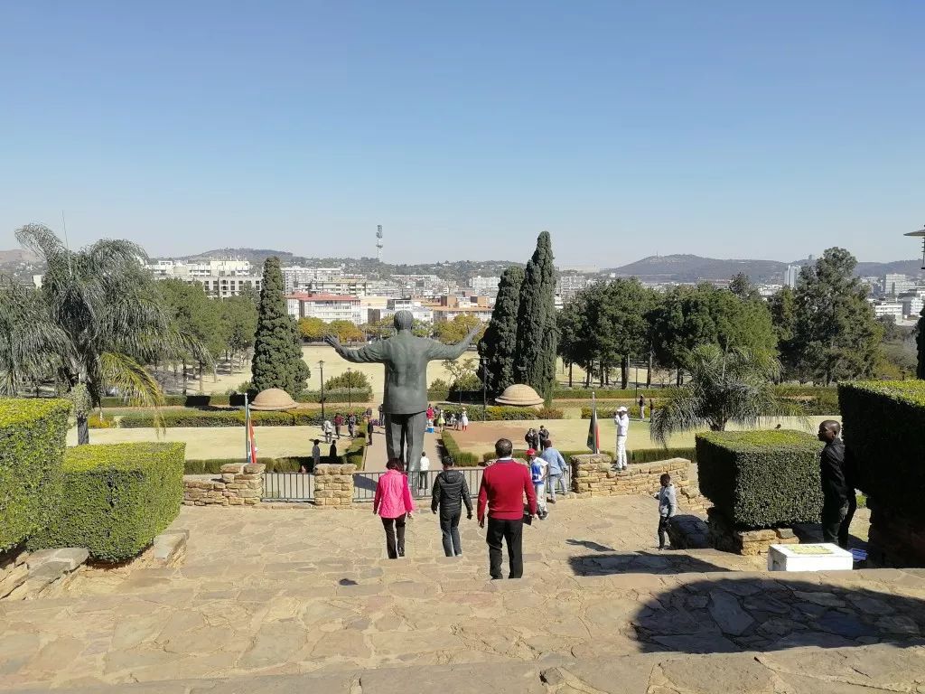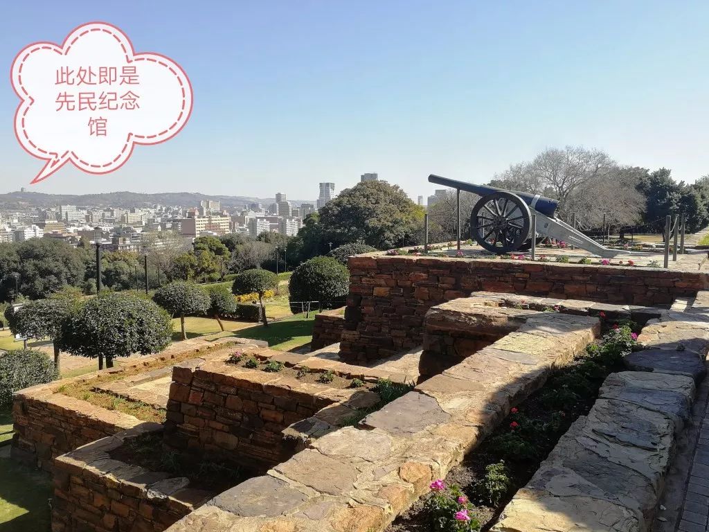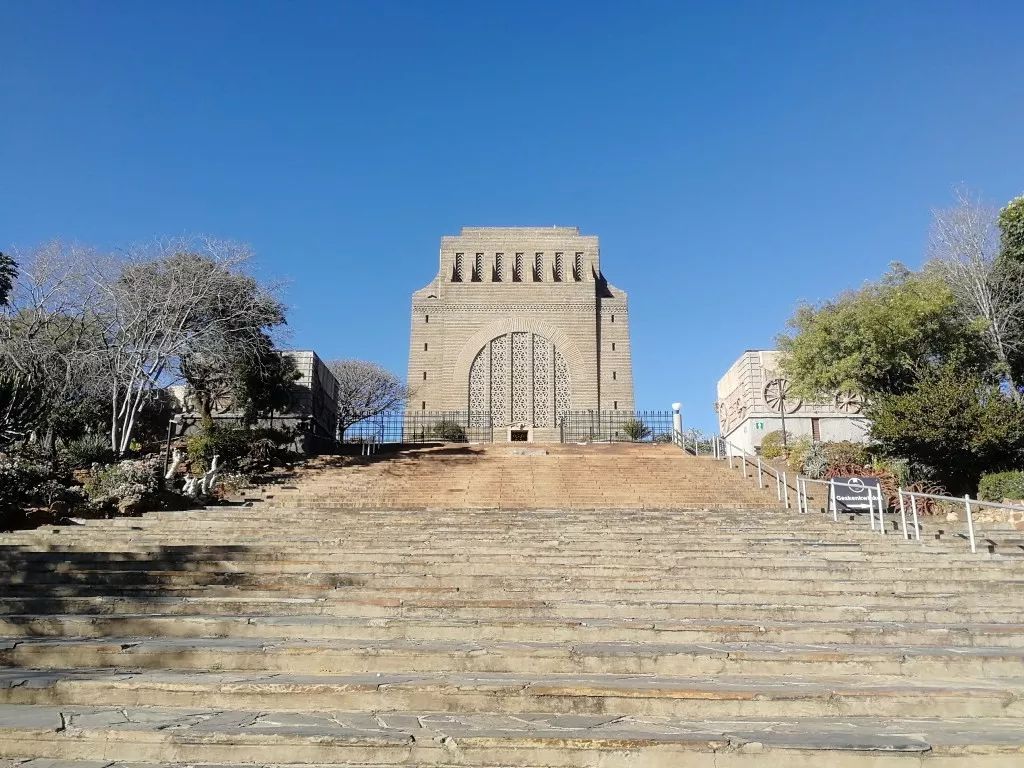 站在聯(lián)邦大廈前,可以從山坡上俯瞰比勒陀利亞全城。對面山坡上方形建筑,就是南非著名的先民紀念館(Voortrekker Monument)。