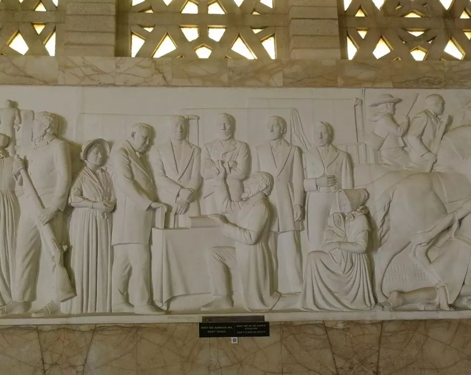在紀念館大堂里的巨大拱形窗下,27幅浮雕詳細講述了當年(1835-1852)荷裔布爾人大遷徙的歷史。每幅浮雕下面,都有一個二維碼。