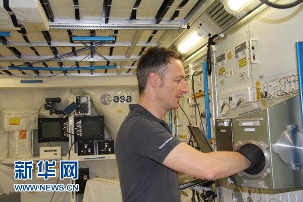 7月18日,在德國科隆,德國宇航員馬天(馬蒂亞斯·毛雷爾)在歐洲航天局哥倫布實(shí)驗(yàn)艙的模擬艙內(nèi)展示實(shí)驗(yàn)操作。 新華社記者張毅榮攝