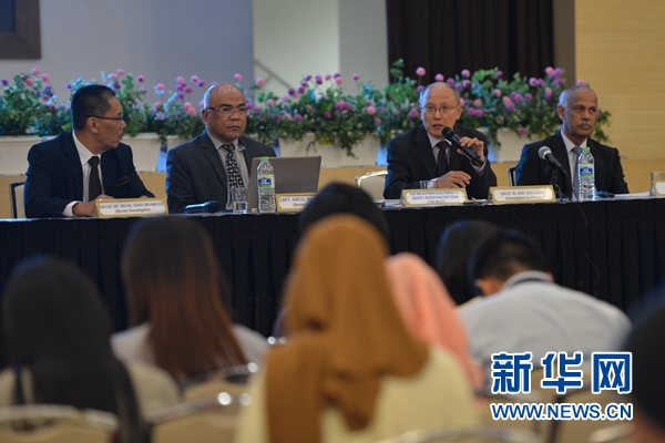 7月30日,馬航370航班客機(jī)安全調(diào)查組負(fù)責(zé)人郭師傳(右二)在馬來(lái)西亞普特拉賈亞舉行的新聞發(fā)布會(huì)上講話。 新華社發(fā)(張紋綜攝)