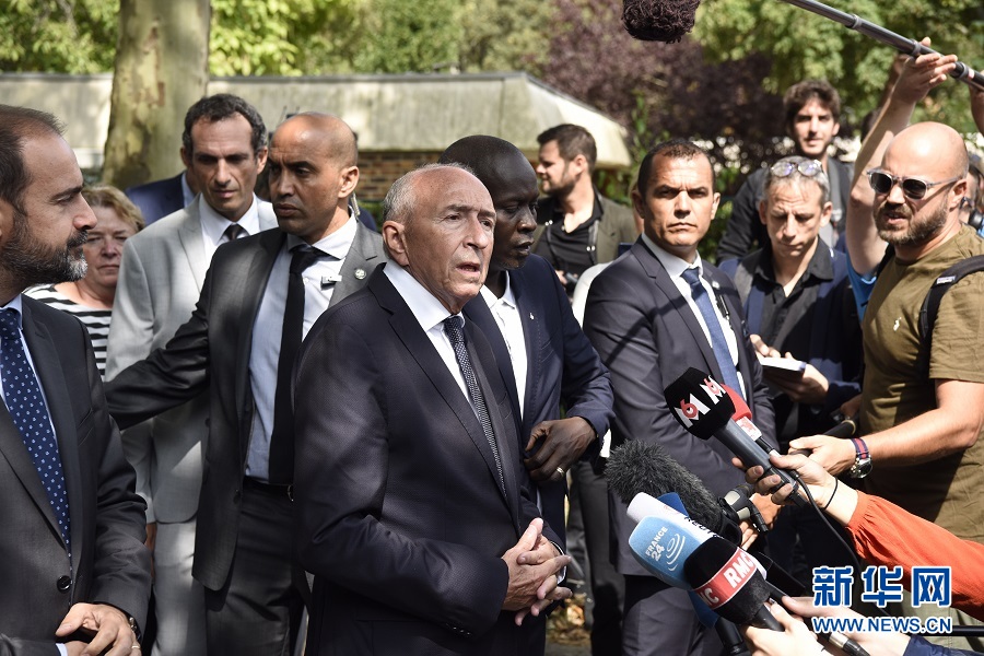 8月23日,在法國(guó)巴黎西南郊特拉普市,法國(guó)內(nèi)政部長(zhǎng)科?。ㄖ校┫蛎襟w介紹情況。 新華社記者陳益宸攝