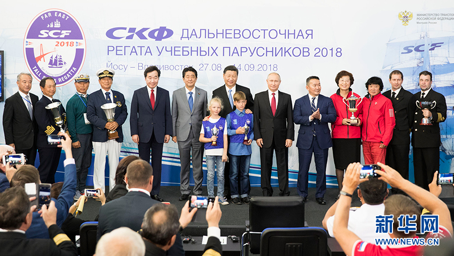 9月12日,第四屆東方經(jīng)濟論壇全會在符拉迪沃斯托克舉行。中國國家主席習(xí)近平、俄羅斯總統(tǒng)普京、蒙古國總統(tǒng)巴特圖勒嘎、日本首相安倍晉三、韓國總理李洛淵等出席。這是全會后,與會各國領(lǐng)導(dǎo)人共同出席第三屆“遠東杯”國際帆船拉力賽第一賽段頒獎儀式。 新華社記者黃敬文攝