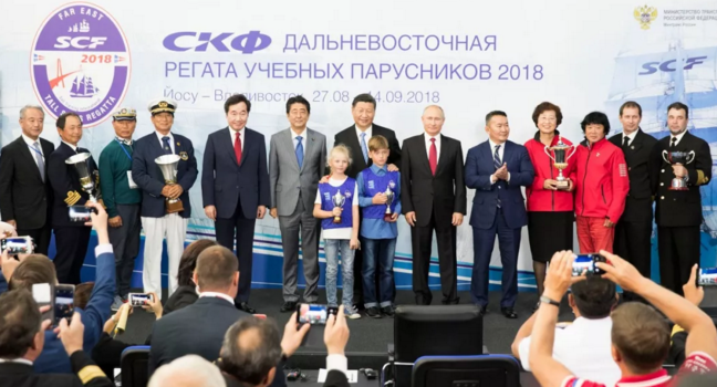 9月12日,第四屆東方經(jīng)濟論壇全會在符拉迪沃斯托克舉行。中國國家主席習(xí)近平、俄羅斯總統(tǒng)普京、蒙古國總統(tǒng)巴特圖勒嘎、日本首相安倍晉三、韓國總理李洛淵等出席。這是全會后,與會各國領(lǐng)導(dǎo)人共同出席第三屆“遠東杯”國際帆船拉力賽第一賽段頒獎儀式。新華社記者 黃敬文 攝