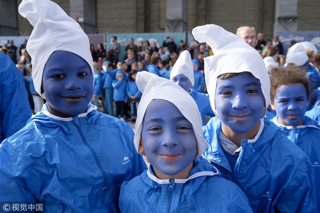 當(dāng)?shù)貢r(shí)間2018年10月23日,比利時(shí)布魯塞爾,民眾參加動畫形象“藍(lán)精靈”60歲慶?;顒印#▓D片來源:視覺中國)