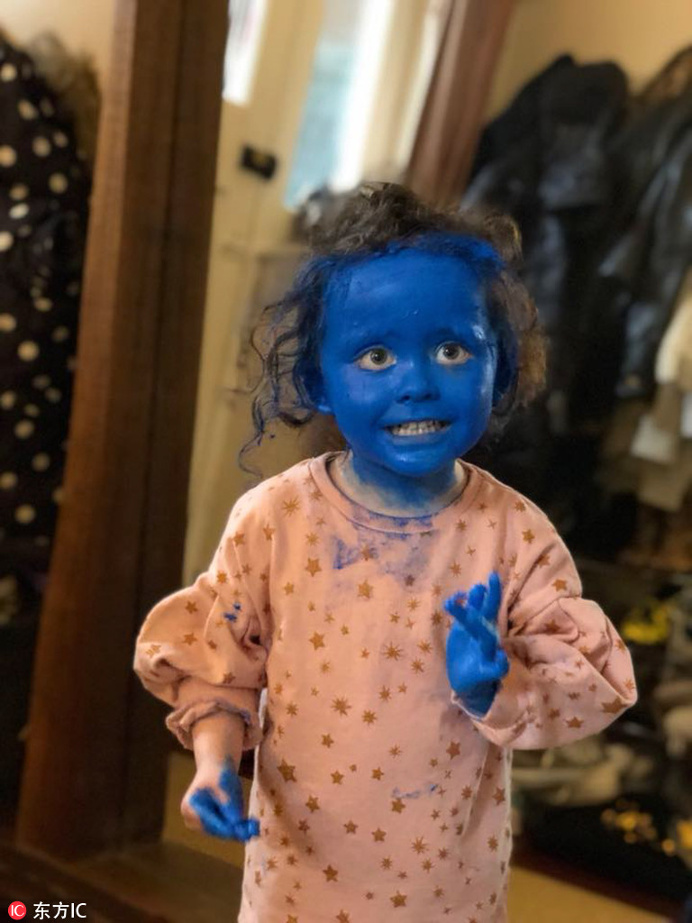 2018年4月17日報(bào)道,國外3歲的小女孩Eve把自己涂抹成了“藍(lán)精靈”!(圖片來源:東方IC)
