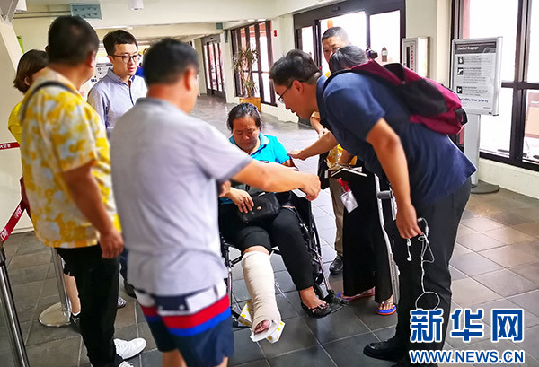 在機(jī)場(chǎng)等候的中國(guó)乘客秩序井然,許多人舉著國(guó)旗合影,非常興奮。一位在塞班開(kāi)店的王女士腳部骨折,因當(dāng)?shù)蒯t(yī)療條件有限,她向領(lǐng)館尋求幫助,經(jīng)領(lǐng)館協(xié)調(diào),也順利搭上川航飛機(jī)回國(guó)。
