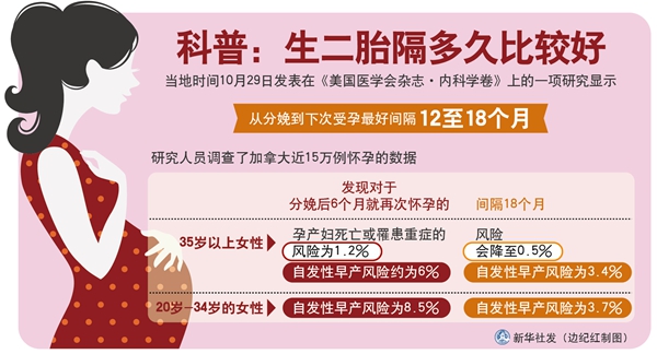 新華社華盛頓10月29日電(記者周舟)生二胎隔多久比較好?29日發(fā)表在《美國醫(yī)學會雜志·內(nèi)科學卷》上的一項研究顯示,從分娩到下次受孕最好間隔12至18個月。