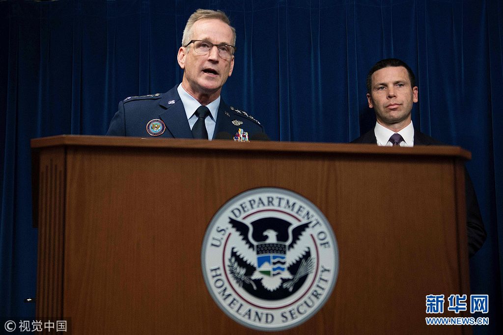 當(dāng)?shù)貢r(shí)間2018年10月29日,美國(guó)華盛頓,美軍北方司令部司令?yuàn)W肖內(nèi)西、美國(guó)海關(guān)和邊境保護(hù)局長(zhǎng)凱文·麥卡利南舉行記者會(huì)。奧肖內(nèi)西29日宣布,美軍將派遣5200名現(xiàn)役士兵前往南部邊境,應(yīng)對(duì)中美洲移民潮。近日,數(shù)千名來自洪都拉斯、危地馬拉和薩爾瓦多等中美洲國(guó)家的民眾穿越邊界進(jìn)入墨西哥。他們或步行、或乘坐大篷車北上,有意穿越墨西哥前往美國(guó)。(圖片來源:視覺中國(guó))
