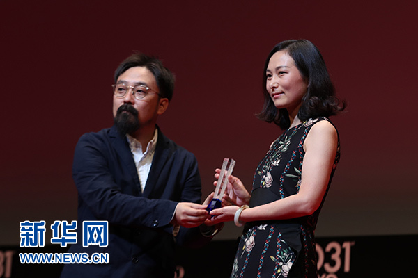 11月2日,在第31屆東京國際電影節(jié)頒獎典禮上,中國導(dǎo)演王麗娜(右)在作品《第一次的離別》獲“亞洲未來”單元最佳影片獎后上臺領(lǐng)獎。 新華社記者 杜瀟逸 攝