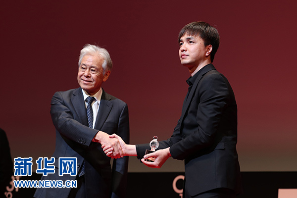 11月2日,在第31屆東京國際電影節(jié)頒獎典禮上,中國導(dǎo)演黃璜(右)在作品《武林孤兒》獲“亞洲未來”單元國際交流基金亞洲中心特別獎后上臺領(lǐng)獎。新華社記者 杜瀟逸 攝